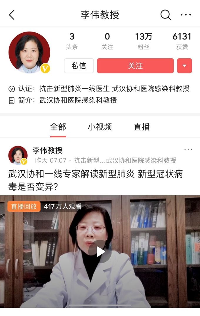 1月27日晚8点,武汉协和医院感染科医生李伟教授在今日头条、抖音平台直播讲解新冠肺炎,为网友科普疫情防控情况,并解答肺炎热点问题。超过400万网友观看了这一直播。