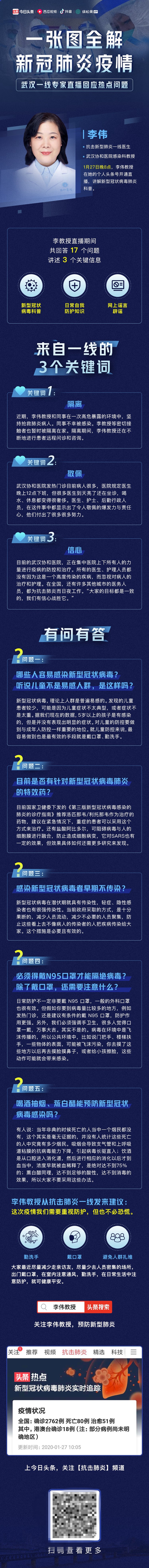 李伟来自华中科技大学同济医学院附属协和医院发热门诊感染性疾病科,担任副主任医师,也是本次抗击新型肺炎一线的医务工作者。在直播中,李伟回答了17个问题,包括新型冠状病毒科普、日常自我防护知识、针对网上谣言辟谣等。
