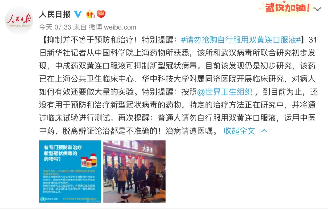 人民日报官方微博今天上午发布特别提醒:抑制并不等于预防和治疗,普通人请勿抢购自行服用双黄连口服液!