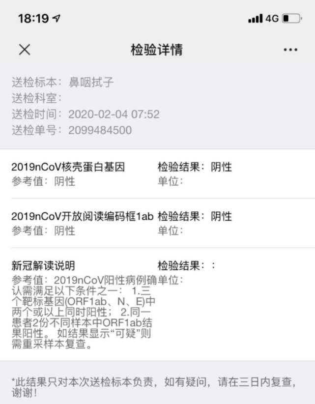 六天后也就是2月4日,我终于下定决心还是要面对现实(第三次去做了检查),这时候的我基本没有任何临床症状。我心想,就算还是阳性我也不怕和它斗,注意隔离不影响别人就好。