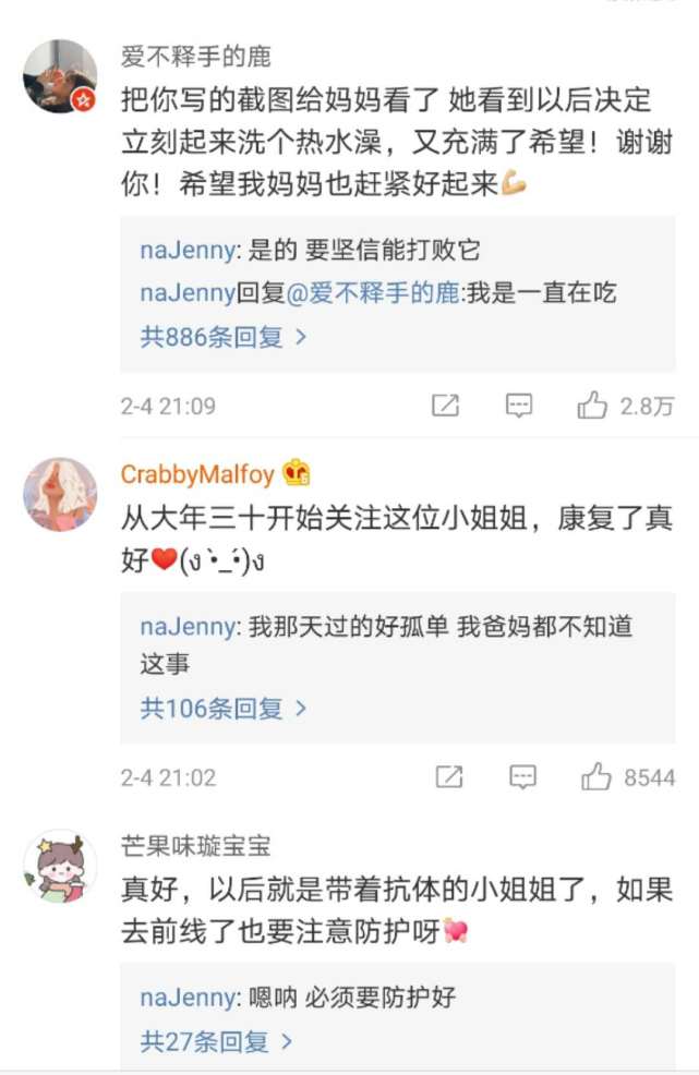 她在微博@najenny上了记录了她从确诊到自愈的11天全过程,已有170多万网友关注着她的动态。最新发布的微博下有1.5万赞。“把你写的截图给妈妈看了,她决定立刻起来洗个热水澡,又充满了希望!谢谢你,希望我的妈妈也赶紧好起来。”有网友留言称。