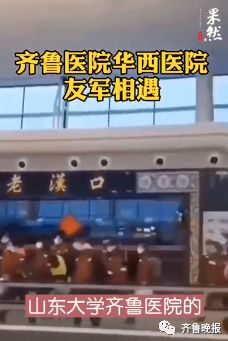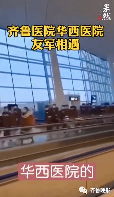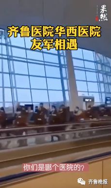 2月7日,在武汉天河机场,山东大学齐鲁医院医疗队到达武汉偶遇四川大学华西医院的医疗队伍两队医生护士隔空呼喊“加油”相互打气。