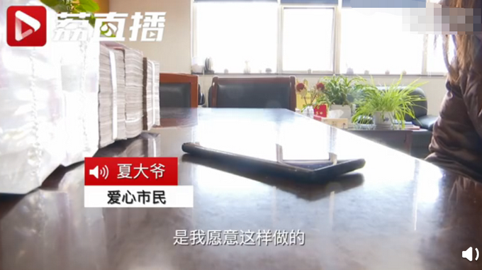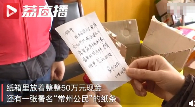 2月9日,常州一位老大爷来到新北区政府,放下一个纸箱就走,称要捐给武汉。纸箱里有50万元现金,和一张署名“常州公民”、为武汉加油的纸条。大家辗转找到捐款的夏大爷,他说自己够吃够用就行,再难也要支持,也不要宣传和表扬。