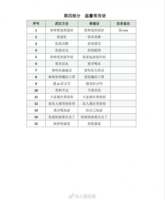 “滋一哈:擦拭一下”“蛮扎实:厉害”“撅一针:打一针”“你蛮灵醒:你很漂亮”……这是山东齐鲁医院医疗队编写的《武汉方言实用手册》中的一部分。网友们纷纷称赞齐鲁医院医疗队“有心”“可爱”,还有网友说,本来是挺喜感的,但是看着看着就哭了。