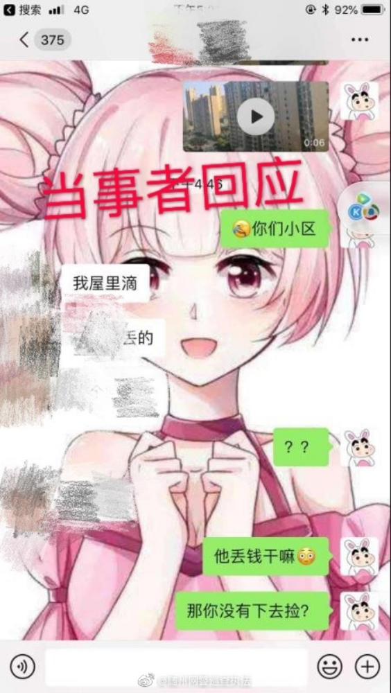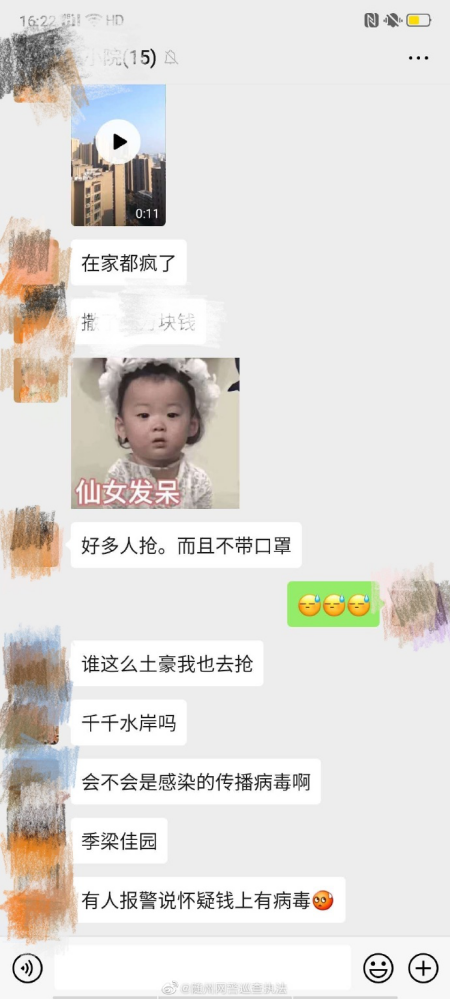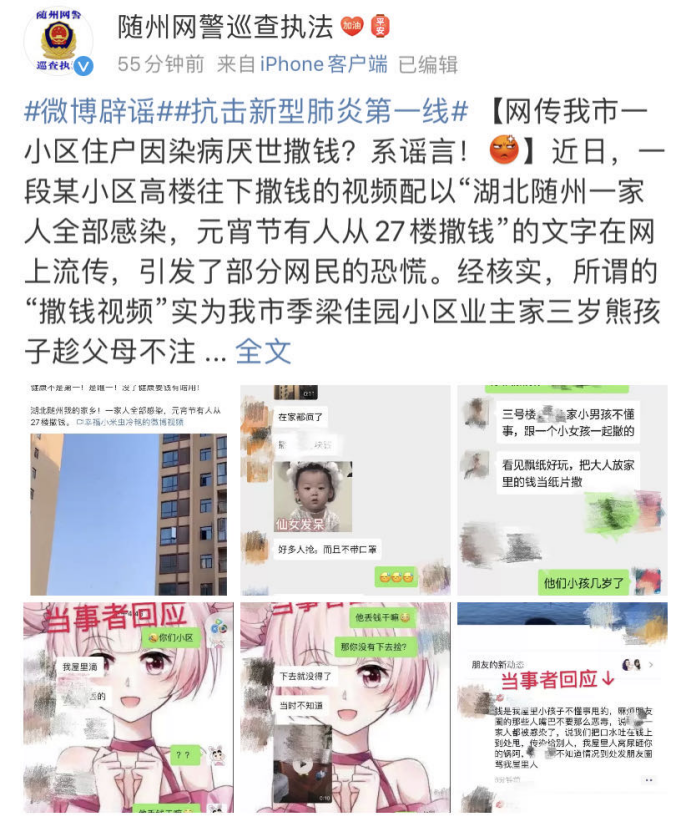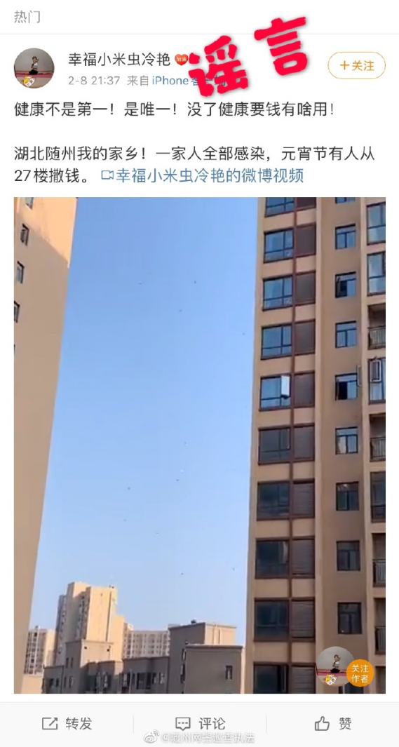 近日,一段某小区高楼往下撒钱的视频配以“湖北随州一家人全部感染,元宵节有人从27楼撒钱”的文字在网上流传,引发了部分网民的恐慌。10日下午,随州市公安局网络安全保卫支队在官方微博对此辟谣:系谣言。