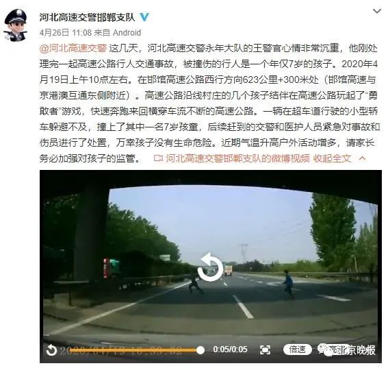 4月19日,京港澳与邯馆高速互通处附近,几个孩子结伴在高速路上玩“勇敢者”游戏,在高速上快速奔跑来回横穿,一辆在最内侧超车道行驶的小轿车躲避不及,撞上了其中一名7岁孩子……