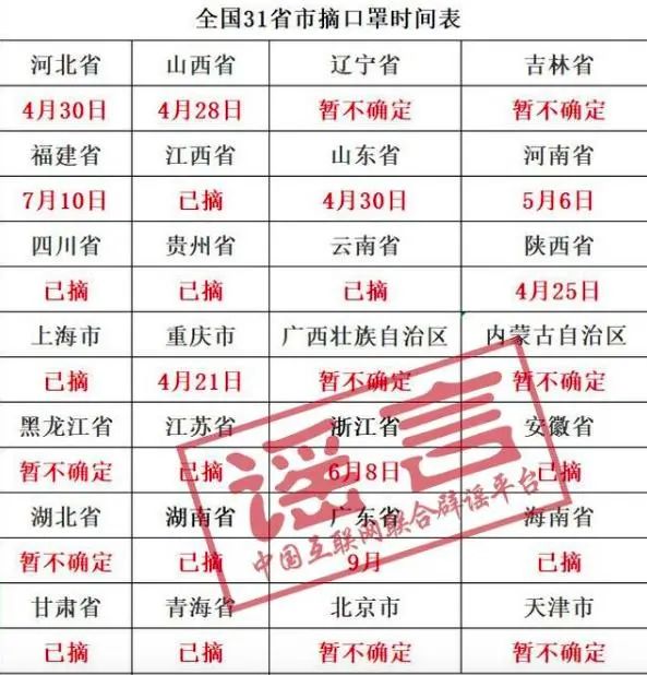 近日,一张“31省市摘口罩时间表”在网上广泛流传,但消息还没捂热,官方辟谣就来了:经查证,广东、上海等相关部门及媒体都没有相关说法。