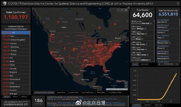 据美国约翰斯·霍普金斯大学发布的全球新冠肺炎数据实时统计系统,截至北京时间5月2日6时32分左右,全美共报告新冠肺炎确诊1100197例,死亡64600例,共检测6551810例。