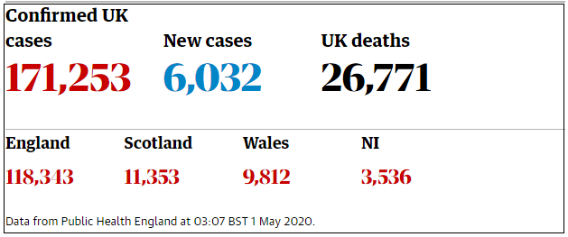 截至5月1日,英国新冠感染人数超16万,死亡人数超2.6万。