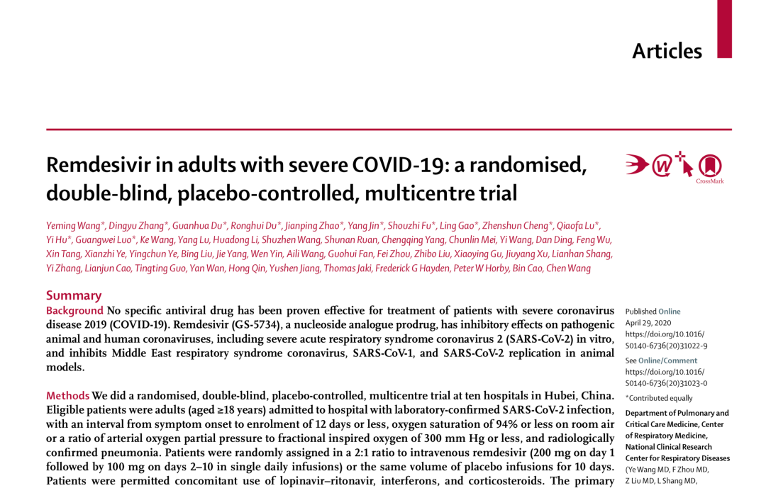 4月29日晚,国际医学期刊《柳叶刀》在线发表论文《瑞德西韦用于成人重症新冠肺炎患者:一项随机、双盲、安慰剂对照的多中心试验》。