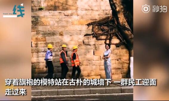 穿着旗袍的模特站在古朴的城墙下,一群民工迎面走过来,他们迈着欢快的小碎步跑着入镜,对着镜头不好意思地挥手,随后迅速走出了镜头。阳光下,模特和工人们的脸上都洋溢着灿烂的笑容,温暖得让人的心都融化了。