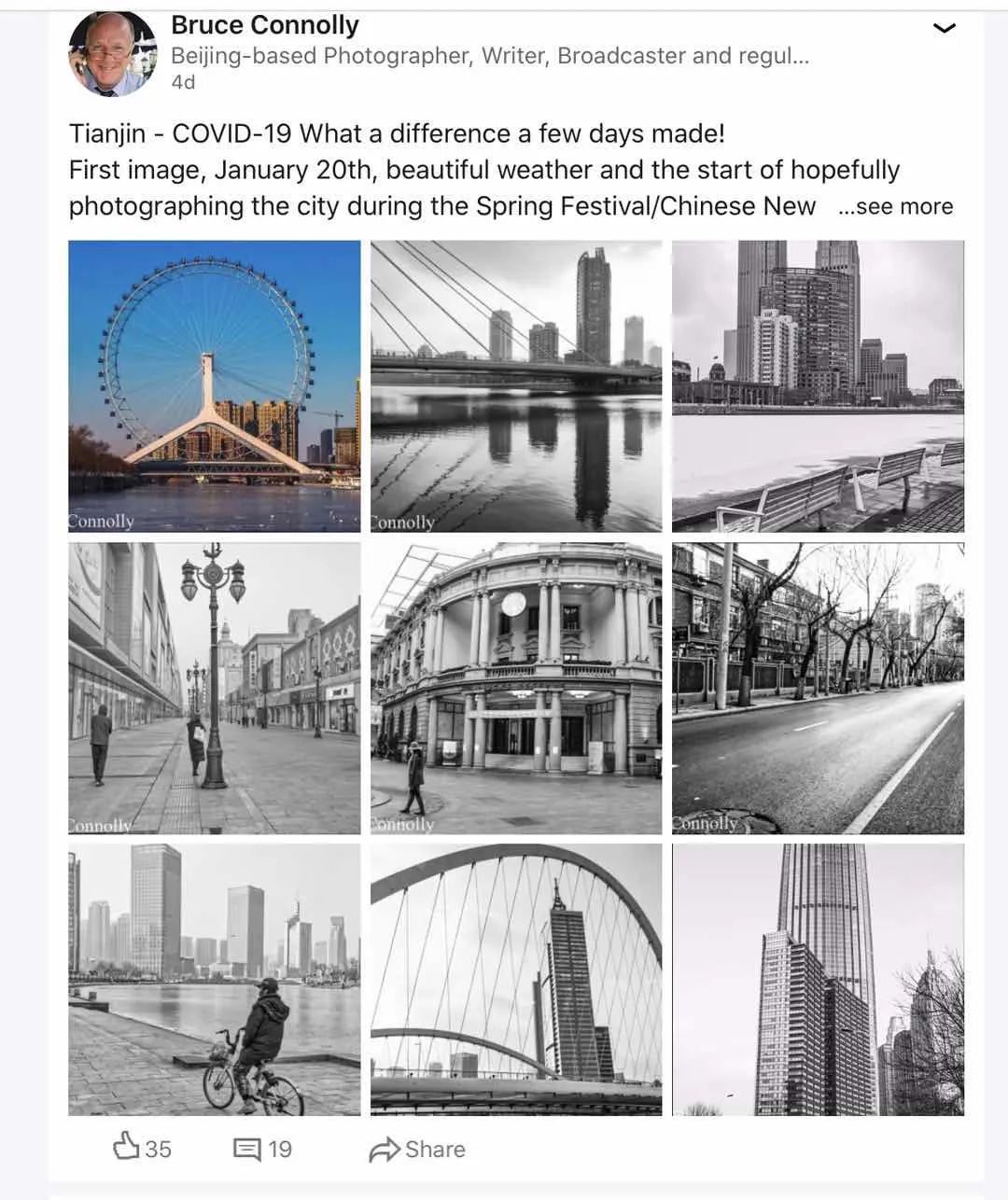 布鲁斯将在天津拍摄的照片发布到社交媒体上