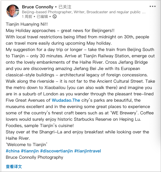 “五一”前,布鲁斯在社交媒体上打出“天津欢迎您”
