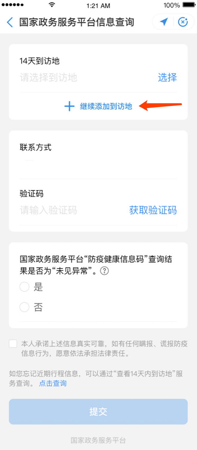 3.填写14天到访地时,北京不是默认的,也要手动填写呦,不要漏掉。点击下图红色箭头处点“继续添加到访地”手动填写。
