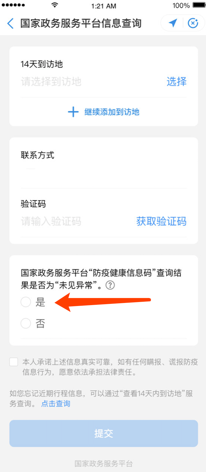 4.国家政务服务平台“防疫健康信息码”查询结果如果是“未见异常”,一定要选择“是”。(见下图红色箭头处)