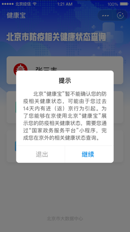 如上图,在您使用“健康宝”进行健康状态查询时,如出现上面的弹窗提示,请点“继续”按钮,跳转至国家政务服务平台。