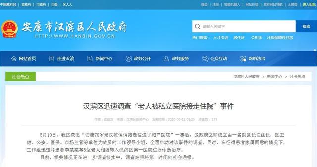 5月10日,“安康78岁老汉被悄悄接走住进了妇产医院”一事后,汉滨区政府立即成立由一名副区长任组长,区卫健、公安、医保、市场监管等单位为成员的工作领导小组,全面启动对该事件的调查。同时,在征得患者家属同意的情况下,工作组迅速将患者李某某等8位老人相继转入汉滨区第一医院进行诊断治疗。