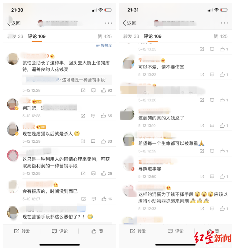 而在新浪微博上,关于该事件有多个热搜话题,大部分网友发出应该立法严惩虐待动物行为的呼声。微博认证为腾讯文学签约作家的“伤麟叹凤_老徐”说:“这种还是报警吧,是因为有人出钱买了,这些人尝到了甜头,才一而再、再而三的这么干。”网友“差点更帅了”则说:“这是一条黑产链,有买卖的。”