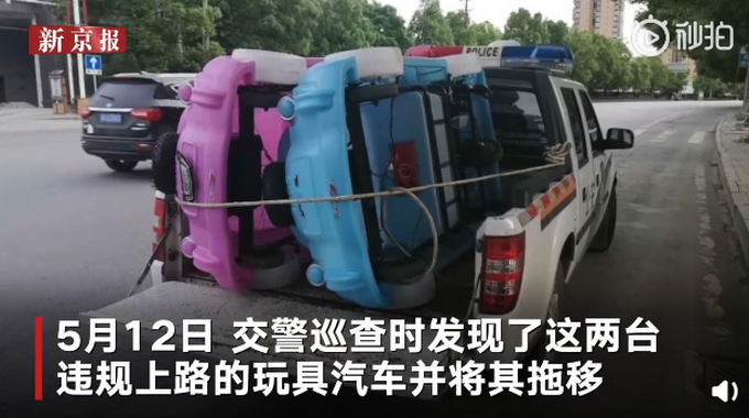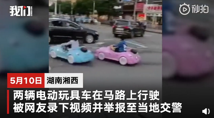10日,湖南湘西花垣县。女子龚某驾驶蓝色玩具车在十字路口横闯红灯,“副驾驶”上还坐着孩子,粉色玩具车由另一男子驾驶,紧随其后。经举报,花垣交警在巡查时将车拖移。龚某:为图便利直接上路开了。警察叔叔:若再发生,收缴销毁!