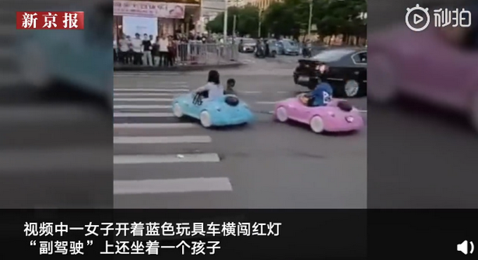 迷幻操作!女子带娃开玩具车还闯红灯 女子龚某驾驶蓝色玩具车在十字路口横闯红灯