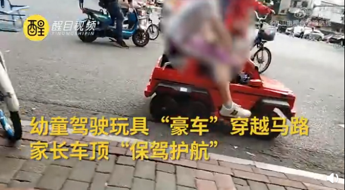 5月11日傍晚,在佛山禅城区莲花路与福禄路交界的红绿灯路口处,有一名家长竟然把儿童电动玩具车当成了交通工具。小孩子坐在车里踩油门或者刹车,而家长就坐在车顶掌握着方向。路上车来车往,两人非常危险。