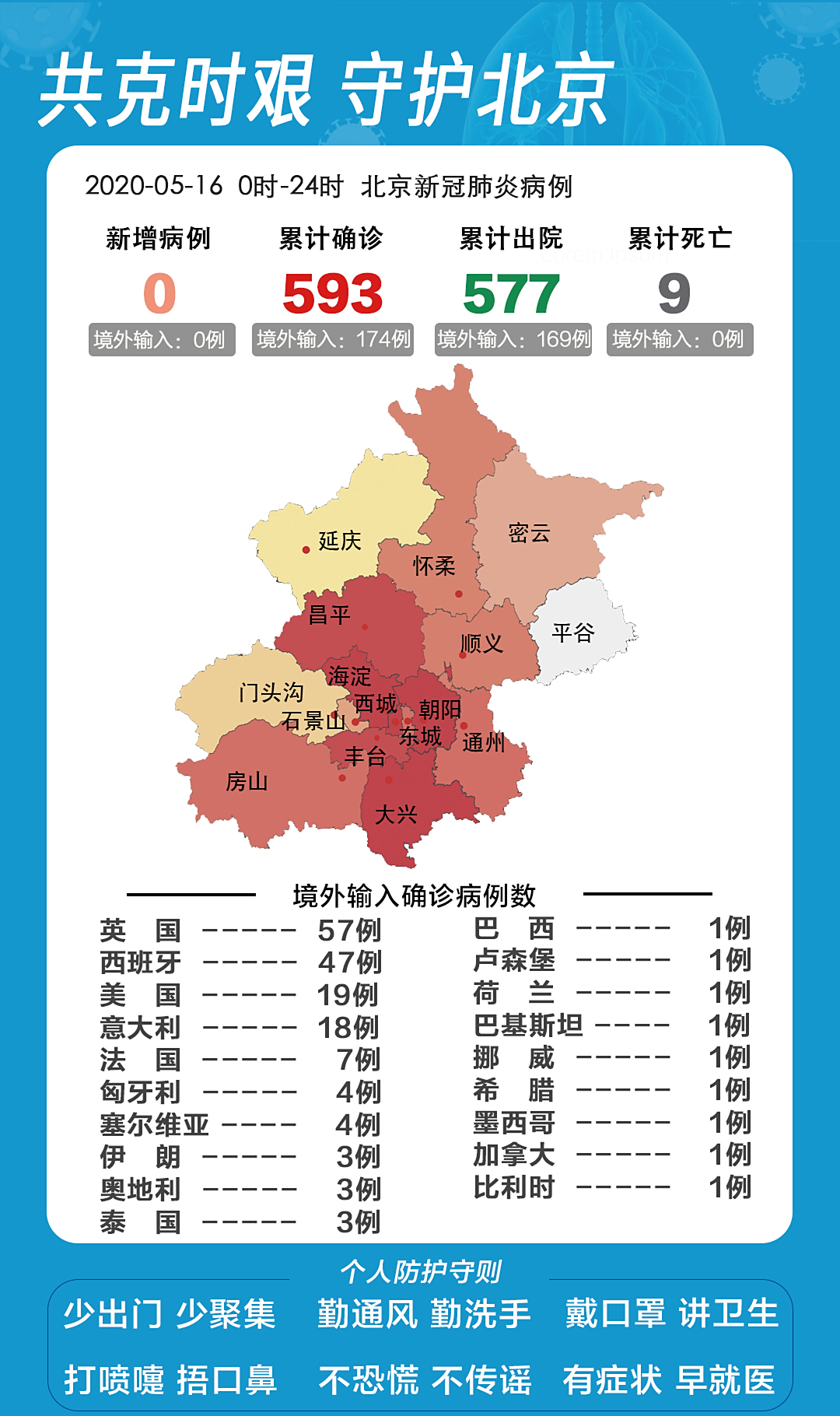 5月16日0时至24时,北京市无新增报告境外输入新冠肺炎确诊病例、疑似病例和无症状感染者,出院1例。截至5月16日24时,累计报告境外输入确诊病例174例,累计出院169例,在院5例。
