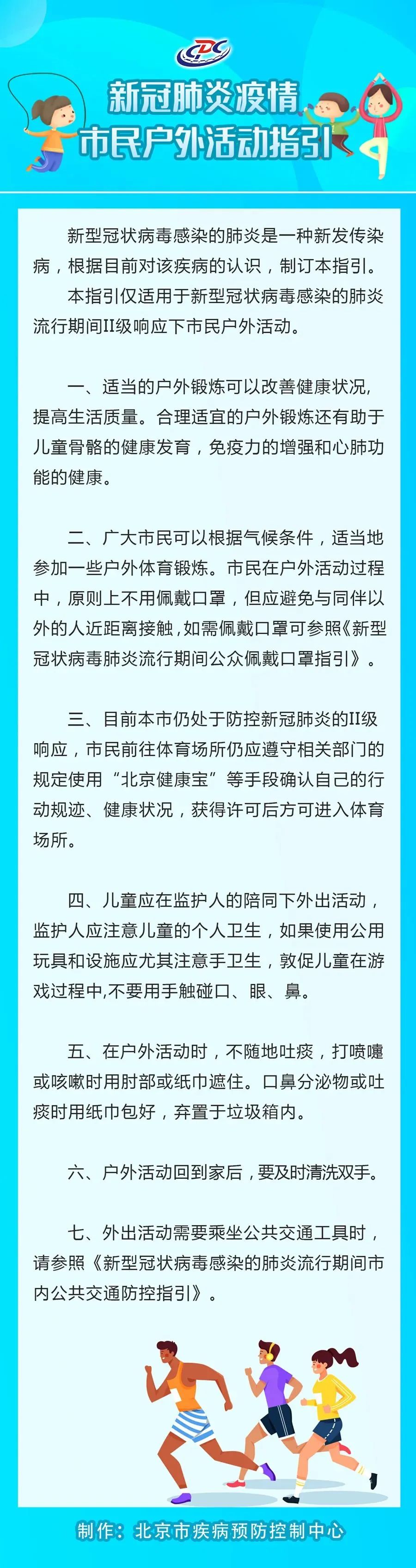 据北京市疾病预防控制中心官方微信公众号消息,北京疾控中心发布《新冠肺炎疫情II级响应防护指引——市民户外活动篇》。文中指出,广大市民可以根据气候条件,适当地参加一些户外体育锻炼。市民在户外活动过程中,原则上不用佩戴口罩,但应避免与同伴以外的人近距离接触,如需佩戴口罩可参照《新型冠状病毒肺炎流行期间公众佩戴口罩指引》。