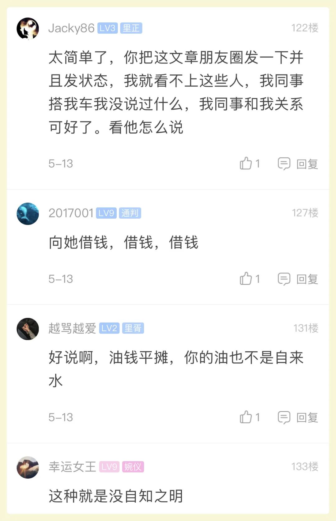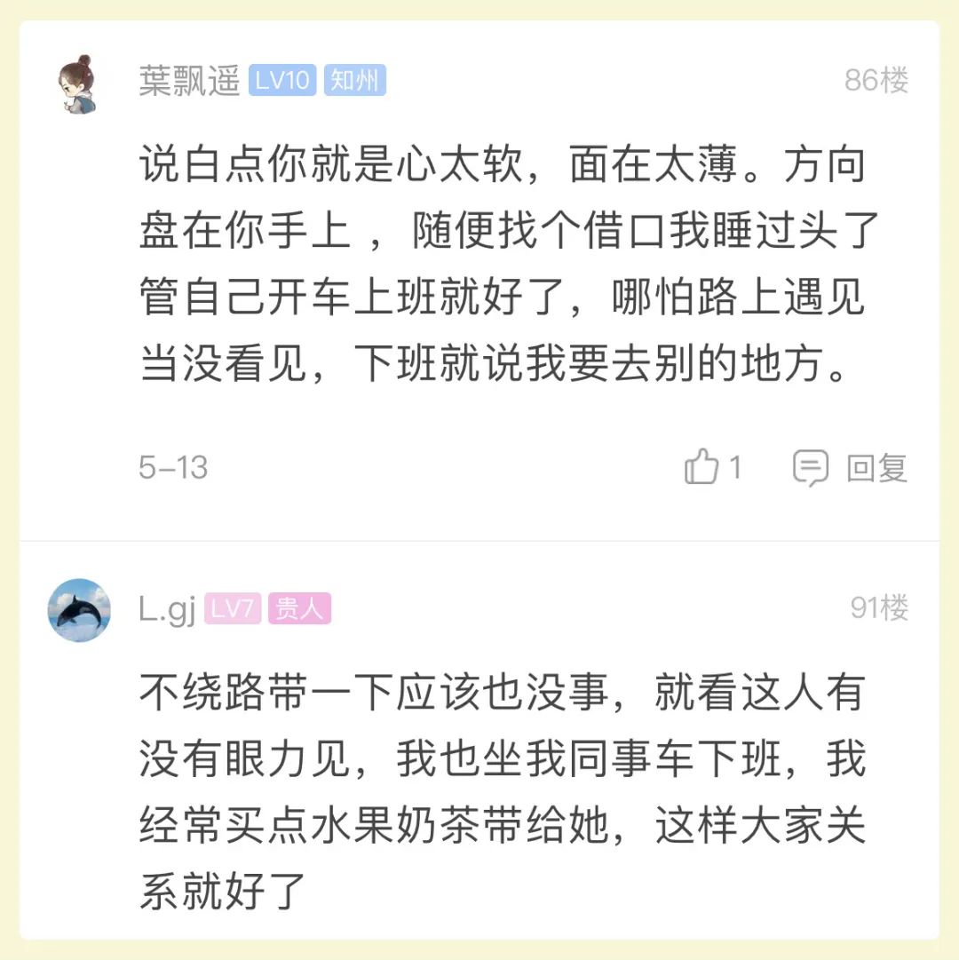 这位前同事经常搭顺风车,因为到处「嚼舌根」导致大家都不愿让带她。为了这事,这位同事还找领导告状,说被大家孤立。