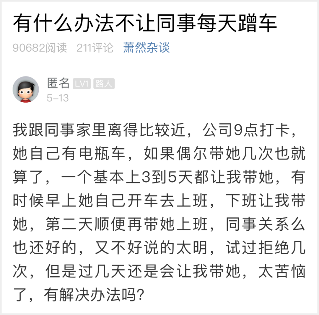 姑娘说,一则其他人关于同事蹭车的吐槽,让她想到了自己的一位前同事。