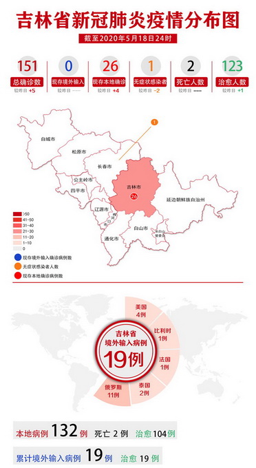 5月18日,吉林省无新增境外输入确诊病例。截至5月18日,全省累计报告境外输入确诊病例19例,累计治愈出院19例(吉林市12例,延边州2例,长春市4例,梅河口市1例)。上述境外输入确诊病例的密切接触者307人,已全部解除医学观察。
