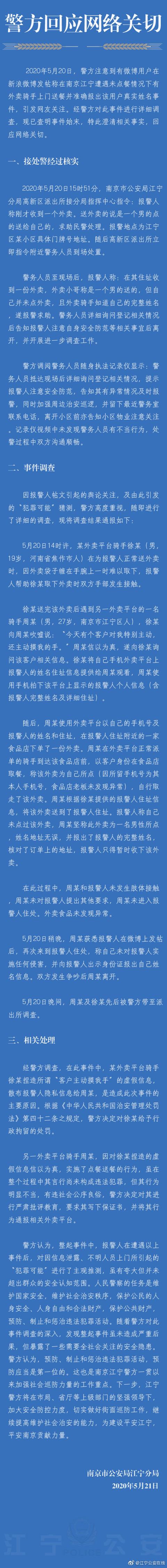 南京市公安局江宁分局消息,2020年5月20日, 警方注意到有微博用户在新浪微博发帖称在南京江宁遭遇未点餐情况下有外卖骑手上门送餐并准确报出该用户真实姓名事件,引发网友关注。经警方对此事件进行详细调查,现已查明事件始末,特此澄清相关事实,回应网络关切。