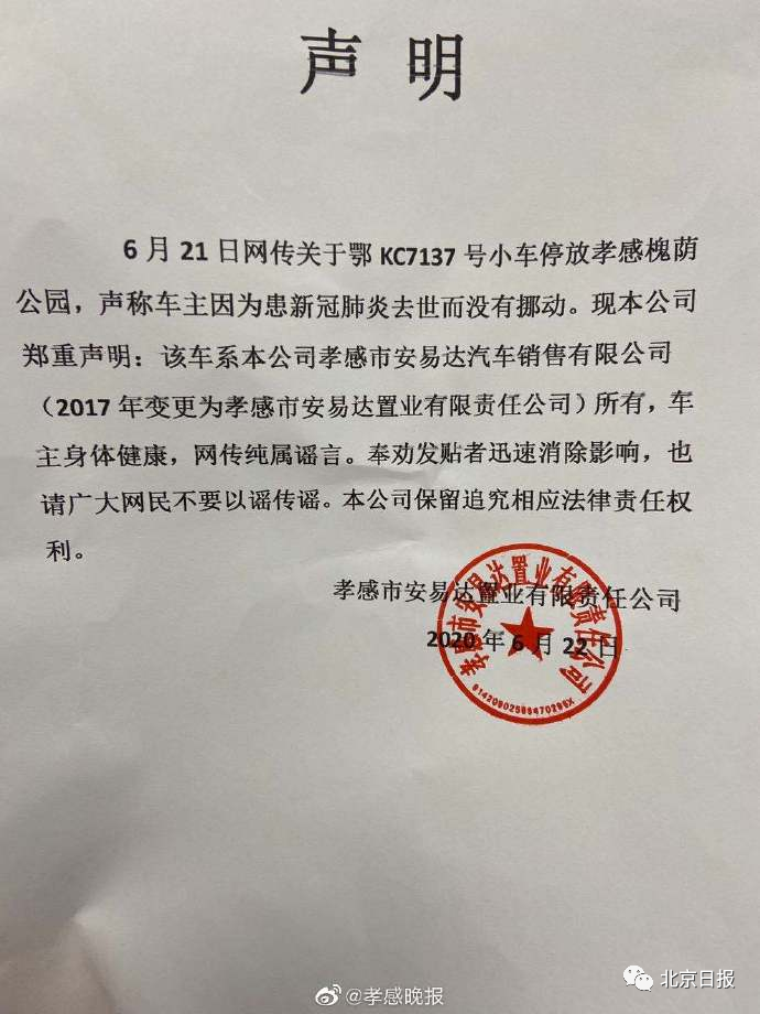 6月22日,经公安机关调查核实,该车所属为孝感一家公司。同日,该公司发布声明称:“6月21日网传关于鄂KC7137小车停放在孝感槐荫公园,声称车主因患新冠肺炎去世而没有挪动。现本公司郑重声明:该车系本公司所有,车主身体健康,网传纯属谣言。奉劝发帖者迅速消除影响,也请广大网民不要信谣传谣,本公司保留追究相应法律责任权力。”