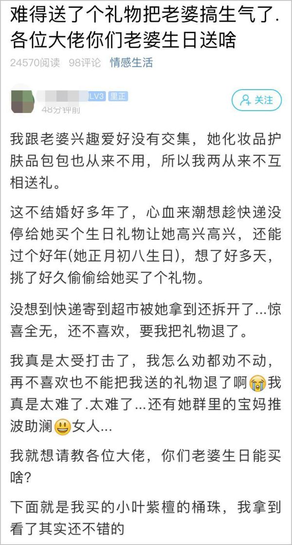 “收到这件礼物,老婆瞬间哭了。”是感动哭还是气哭,各位男同胞心里也要有点数。