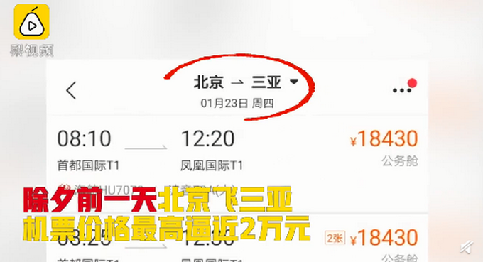 1月17日据媒体报道,春节期间三亚机票酒店价格暴涨。除夕前一天,北京飞三亚直飞均超1万元,最高超过1.8万元。数据显示,春节前三天多个城市飞三亚只剩全价舱和商务舱。而三亚酒店价格涨幅领跑全国,部分酒店相比平日涨3倍,总统套房最高9.8万。