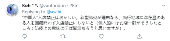 “不让‘中国人’入店太奇怪了。如果非说是怕感染新型肺炎的话,那应该是不论国籍,所有在发病地区待过的人都一律禁止进入才对。”