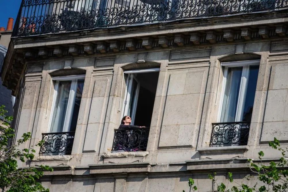 2020年4月13日,在法国巴黎西岱岛,一名女子在窗边晒太阳。(新华社发)