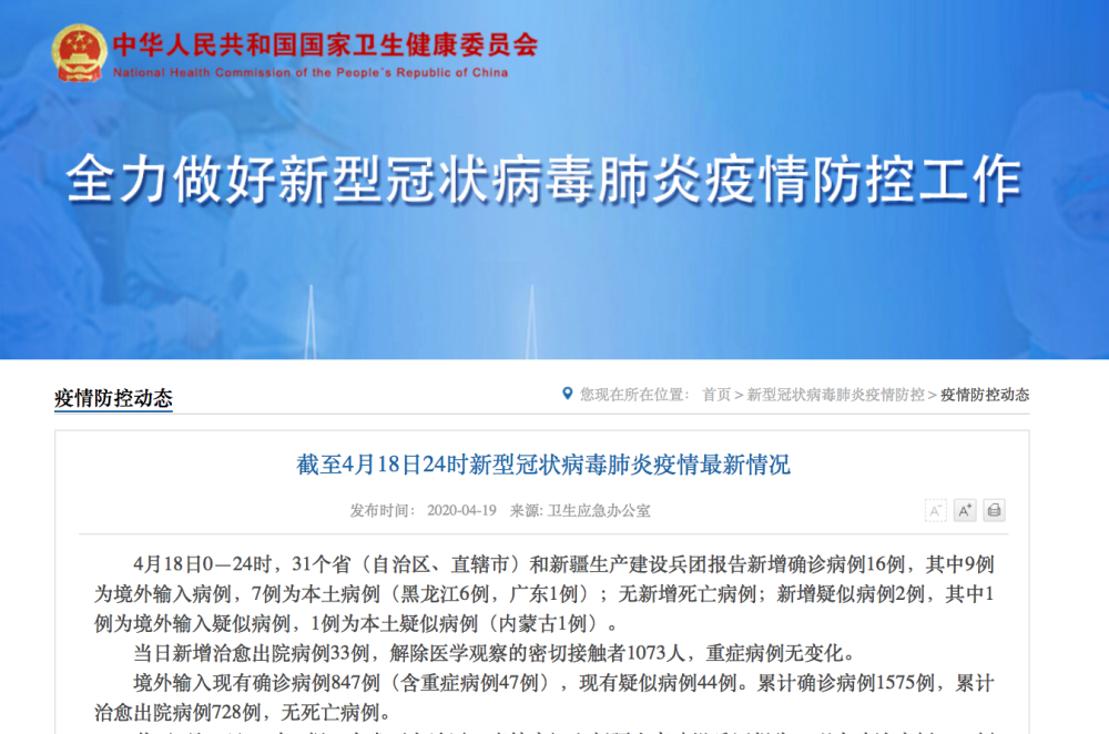 4月18日0―24时,31个省(自治区、直辖市)和新疆生产建设兵团报告新增确诊病例16例,其中9例为境外输入病例,7例为本土病例(黑龙江6例,广东1例);无新增死亡病例;新增疑似病例2例,其中1例为境外输入疑似病例,1例为本土疑似病例(内蒙古1例)。
