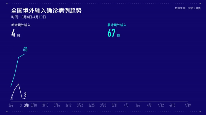 4月19日0-24时,31个省(自治区、直辖市)和新疆生产建设兵团报告新增确诊病例12例,其中8例为境外输入病例,4例为本土病例(黑龙江3例,内蒙古1例);无新增死亡病例;新增疑似病例2例,均为境外输入疑似病例(上海2例)。