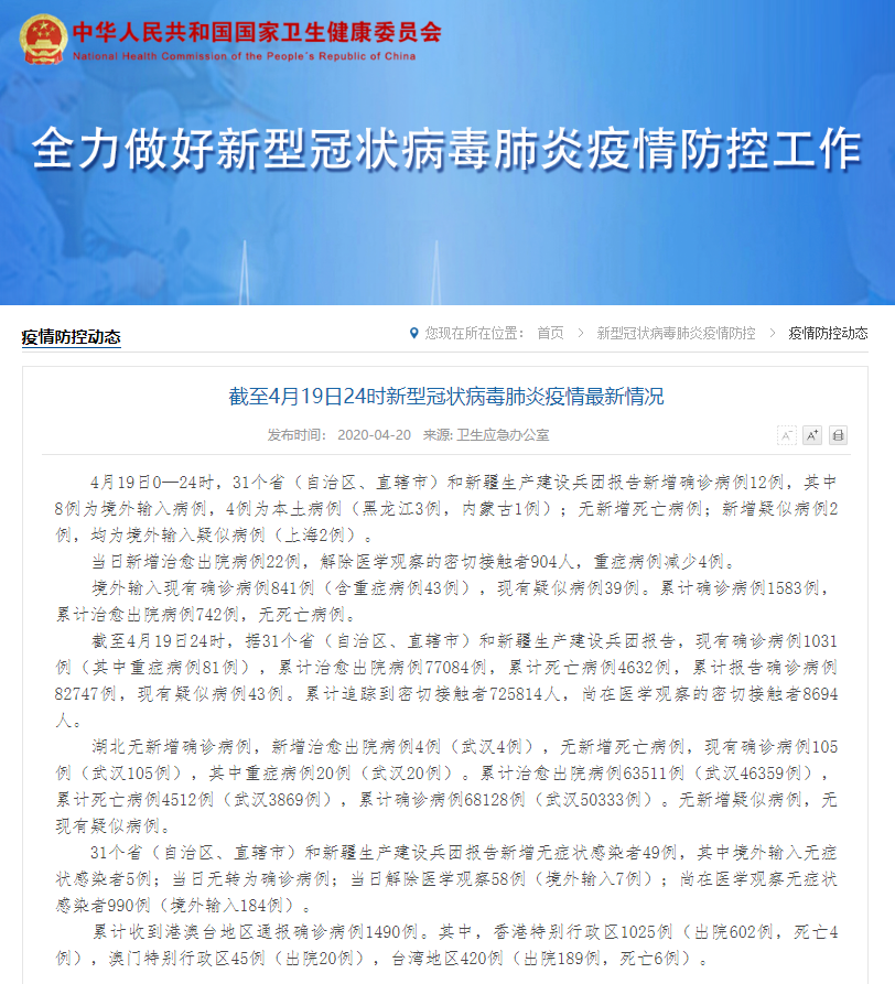 4月19日0-24时,31个省(自治区、直辖市)和新疆生产建设兵团报告新增确诊病例12例,其中8例为境外输入病例,4例为本土病例(黑龙江3例,内蒙古1例);无新增死亡病例;新增疑似病例2例,均为境外输入疑似病例(上海2例)。