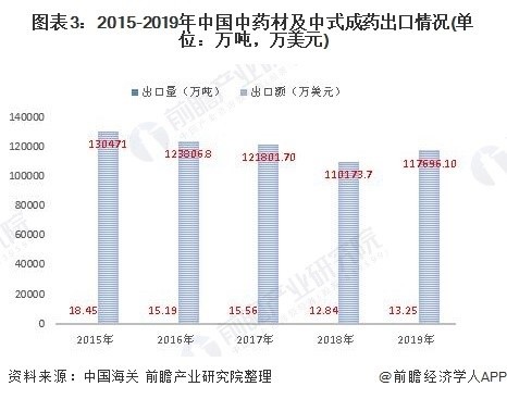 前瞻产业研究院分析海关数据得出,近年来我国中成药出口数量呈波动趋势。2018年中国中药材及中式成药出口数量为128400吨,同比下降17.6%;2019年中国中药材及中式成药出口数量为132515吨,同比增长3.2%。2018年中国中药材及中式成药出口金额为1101737千美元,同比下降9.5%;2019年中国中药材及中式成药出口金额为1176961千美元,同比增长6.8%。