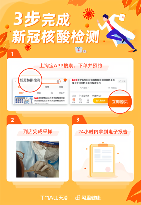 鉴于疫情防控呈常态化趋势,阿里健康宣布,联合美年大健康天猫旗舰店、迪安健检天猫旗舰店等,推出在线预约新冠肺炎核酸检测服务。自21日起,北京、杭州、上海、广州、成都、南京、深圳、西安、温州、济南10大城市居民,可以在淘宝或天猫搜索“新冠核酸检测”,在线预约检测,最快一天可获取电子报告。