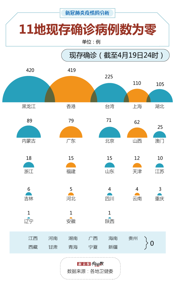 目前,江西、河南、湖南、广西、海南、贵州、西藏、甘肃、青海、宁夏、新疆11地现存确诊病例数为零。