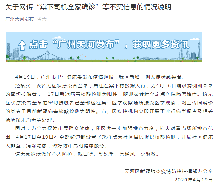 广州卫生健康委发布疫情通报,天河区新增一例无症状感染者。网传“棠下司机全家确诊”,随后广州天河发布公告表明该消息为不实信息。该无症状感染者为16日确诊患者的出租车司机的密切接触者。