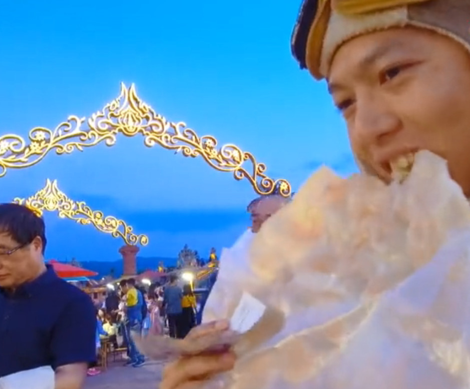 而在当地还有一种很特别的小吃,在路边摆着一个炭炉,傣族大姐拿着两个竹篾在上面烤着一种类似饼的小吃,做法真是太特别了,而且大姐还穿着傣族的特色衣服,让人忍不住走近去的瞧瞧。其实这种小吃在当地叫做豪崩,是一种用糯米做成的小吃,原本是小小的一片,但是在炭火上烤一烤,慢慢的就变得很大了。