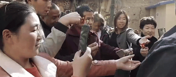 也许是大衣哥怕得罪村民,也许是他被逼得没办法,走出家门的朱之文强颜欢笑地配合着大家的合影、视频……