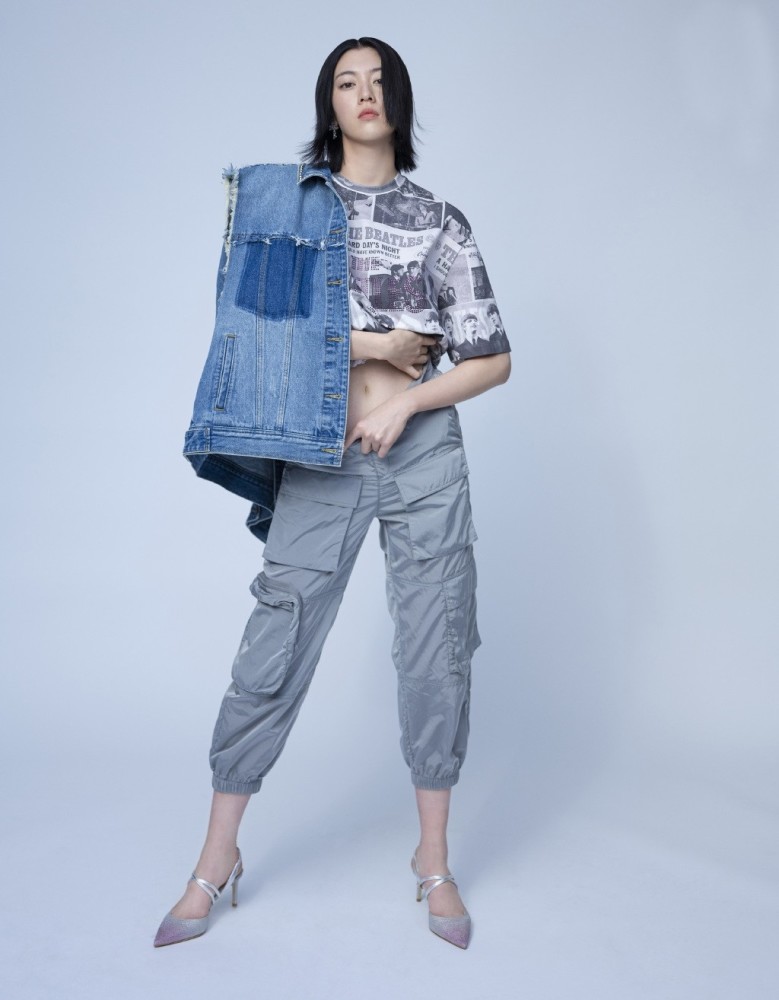 4.T恤牛仔衣配工装裤:显腿长,个性