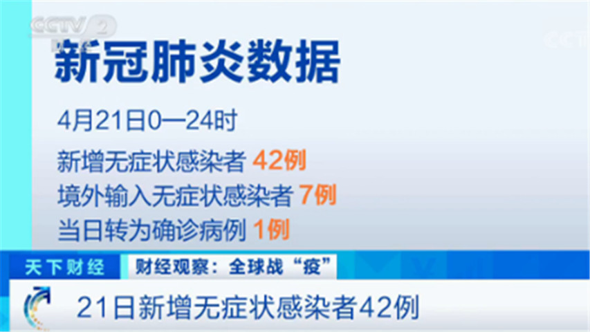 21日,31个省(区、市)和新疆生产建设兵团报告新增无症状感染者42例,其中境外输入无症状感染者7例;当日转为确诊病例1例;尚在医学观察无症状感染者991例,其中境外输入172例。