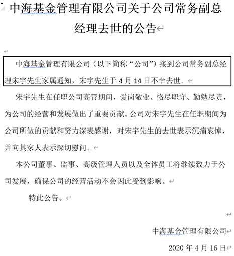 中海基金表示,宋宇在任职公司高管期间,爱岗敬业、恪尽职守、勤勉尽责,为公司的经营和发展做出了重要贡献。公司对宋宇先生在任职期间为公司所做的贡献和努力深表感谢,对宋宇先生的去世表示沉痛哀悼,并向其家人表示深切慰问。