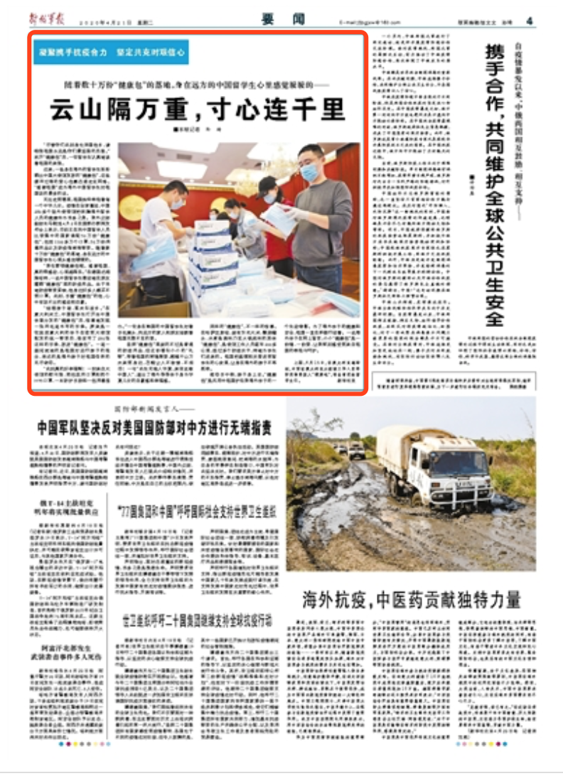 ã€€ã€€æ— è®ºèµ°åˆ°å“ªé‡Œï¼Œç¥–å›½å§‹ç»ˆç‰µæŒ‚ç€æ¯ä¸€ä¸ªä¸å儿女。疫情在全çƒè”“延,ä¸å›½280多个驻外使领馆把ä¿éšœæµ·å¤–ç•™å¦äººå‘˜çš„å¥åº·ä½œä¸ºå½“åŠ¡ä¹‹æ€¥ã€‚æˆ‘å¤–äº¤éƒ¨å‰¯éƒ¨é•¿é©¬æœæ—4月2æ—¥åœ¨å›½æ–°åŠæ–°é—»å‘å¸ƒä¼šä¸Šè¡¨ç¤ºï¼Œç›®å‰æ£åœ¨å‘ä¸å›½ç•™å¦äººå‘˜æ¯”较集ä¸çš„国家调é…50万份“å¥åº·åŒ…â€ï¼ŒåŒ…括1100多万个å£ç½©ï¼Œ50万份消毒用å“以åŠé˜²ç–«æŒ‡å—ç‰ç‰©èµ„。éšç€æ•°å万份“å¥åº·åŒ…â€çš„è½åœ°ï¼Œèº«åœ¨è¿œæ–¹çš„ä¸å›½ç•™å¦ç”Ÿå¿ƒé‡Œå¤´æ„Ÿè§‰æš–暖的。