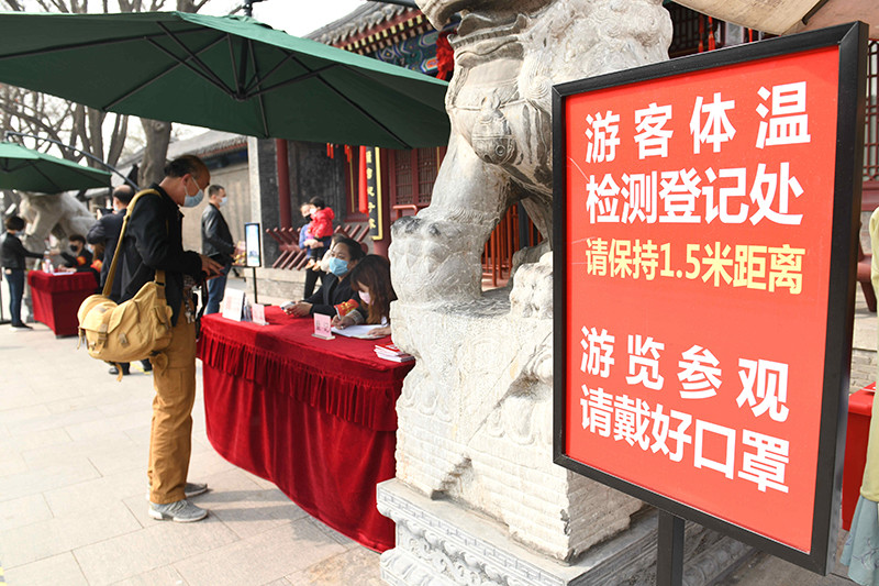 3月23日,游客在河北正定荣国府影视基地登记并测量体温。新华社发(陈其保摄)